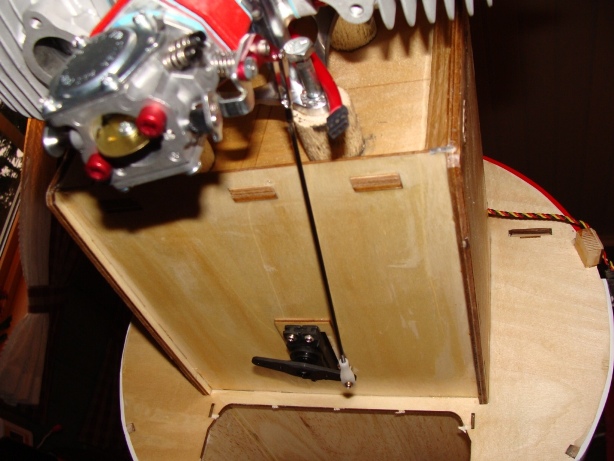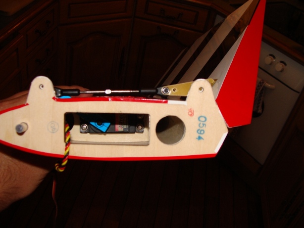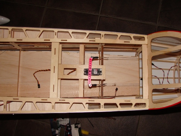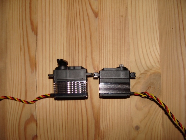Men stabben må man være litt lur. Der ligger servon på siden. Så her må man sentrere servon først og så sette på servoarmen. Så svinges den 90 grader langsmed servo for å få plass igjennom hullet. Se bilde. Greie utslag eller?