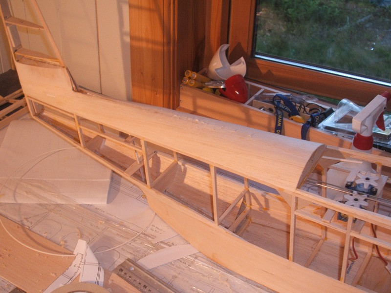 Okei på tide med en ørliten oppdatering, har ikke gjort mye men fiklet litt med styringen til vannroret.. Så har jeg startet med plankingen av bakre toppen på kroppen...er ikke mye igjen av kroppen nå...Må ha på litt glassfiber på siden av kroppen og få formet til en nesekuppel...