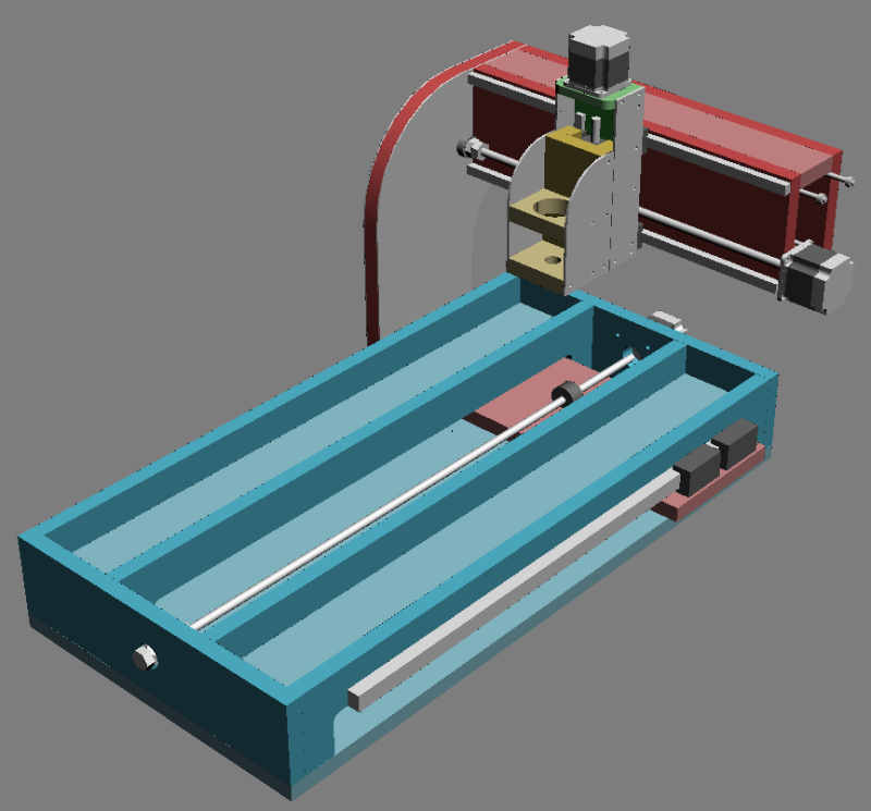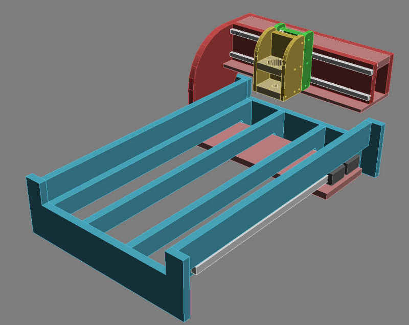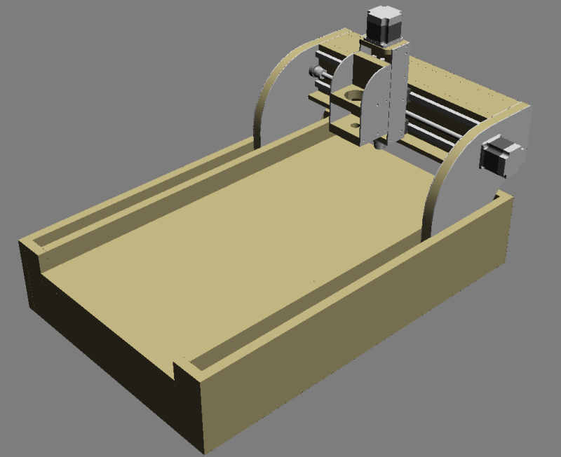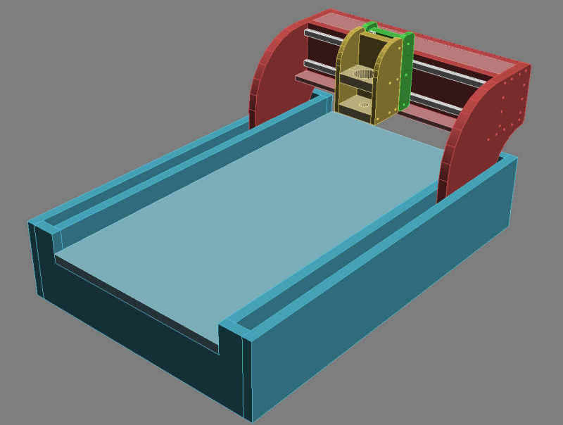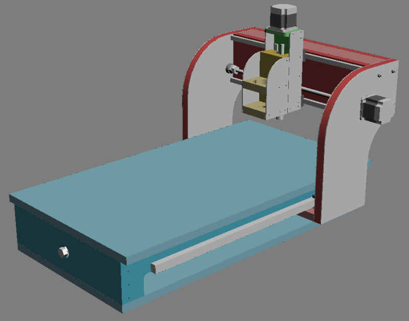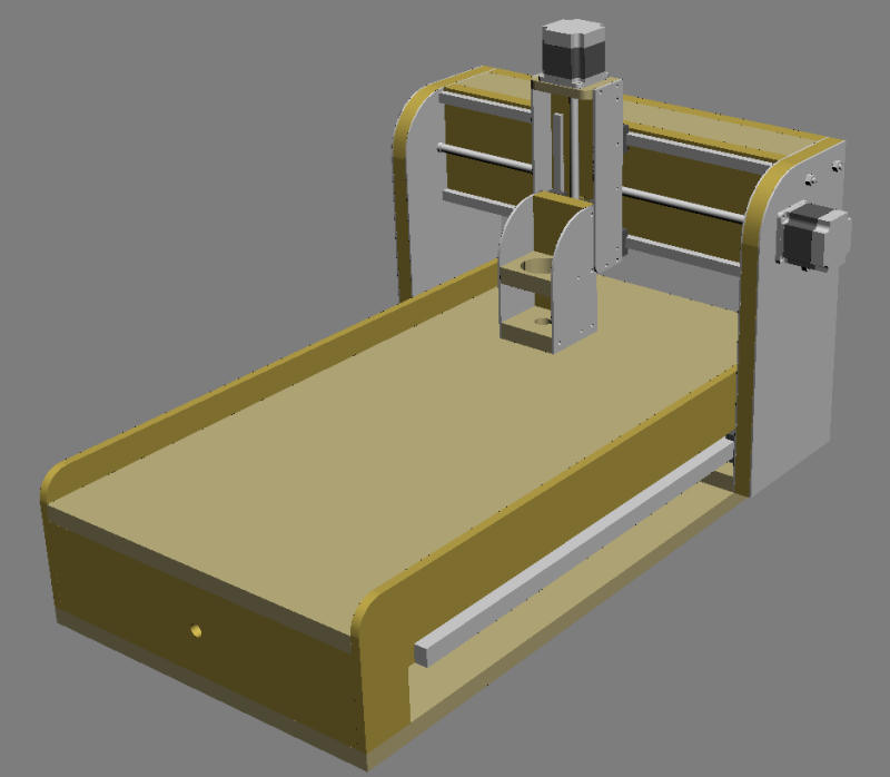 Her er første skisse på en hjemmelaget CNC-maskin. Jeg har tenkt å hovedsakelig bruke MDF og MDF/aluminium sandwich. Siden jeg ikke har noe elektronikk, motorer eller føringer så har jeg ikke tegnet inn alt. Jeg vil forandre på mye og legge til det jeg trenger når jeg får det.