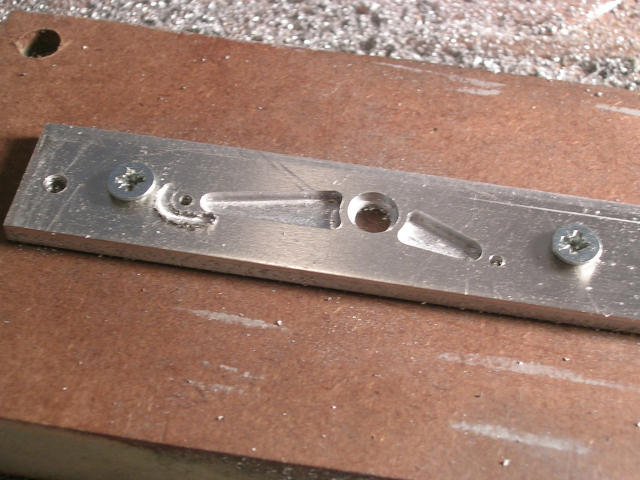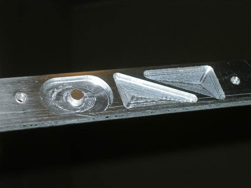 Her er et bilde av resultatet. jeg prøvde meg bare på litt 2 mm dyp pocketing i 4 mm aluminium. Den lillt sylinderen inni ovalen skal være helt rund. Der tror jeg spindelfestet har skylden. I tilleg ser dere noen merker i bunnen av ovalen og den ene triangelen. Det tror jeg også er på grunn av fleksing i MDF spindelfestet. Jeg får se når jeg får alufestet. Ellers ser der veldig bra ut.Plata er ca 22 mm bred og 4 mm tykk.