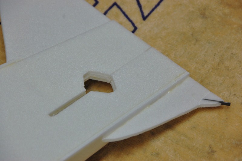 Etter vingene var det høyderoret som skulle på plass og igen var det bare å tre det inn i kroppen og ha på lim, pass på at alle vinkler og mål ut fra vingetuppene slik at den sitter rett på før du fester den for godt. Sideroret hengsles med den medfølgende hengsleteipen.