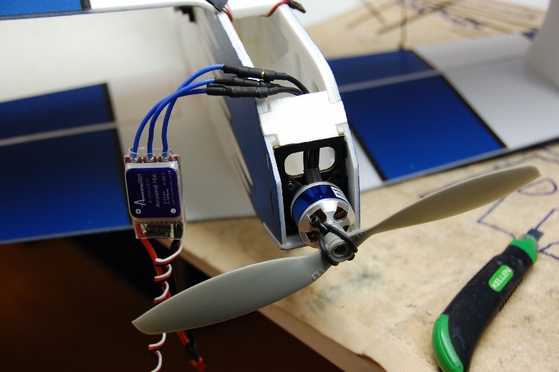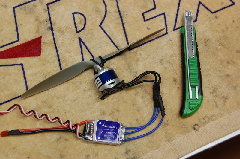 Motoren som følger er av ganske stor kaliber og på 3s oppsett blir nok dette et ganske sprekt oppsett og er kanskje best egnet for større innendørs og utendørs flyging da vekten ligger rett oppunder 300 gram flyferdig, skal også teste flyet med et lettere innendørs oppsett på 2s og 3s og se hvordan vekten blir da.