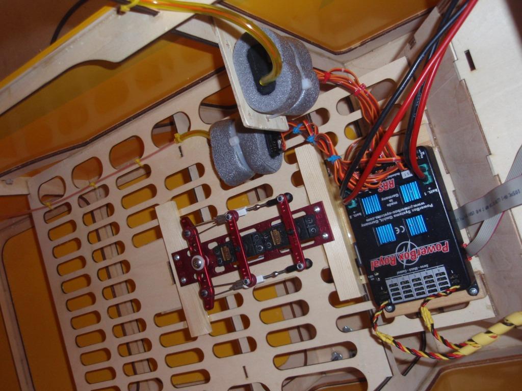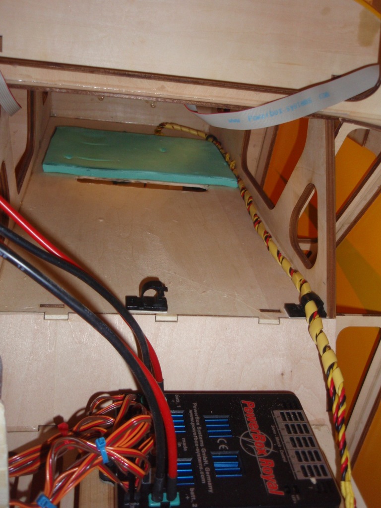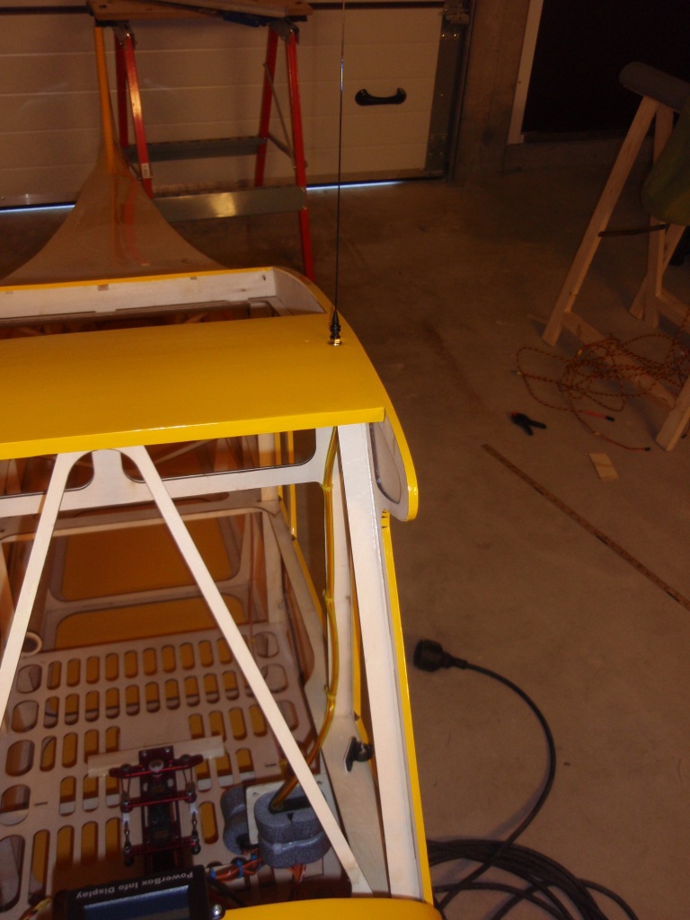 All kabling inn til powerboxen er nå ferdig, og mottakere er montert i flyet. Piskantenne er montert på den ene mottakeren. Monterer kablene fra powerboxen til vinger og høyderor når jeg har justert utslag på rorene, greit å gjøre det slik da jeg ikke har plass til å montere vingene på flyet i garasjen, og det er greit å kunne jobbe med bakvingene og høyderorene på arbeidsbenken.