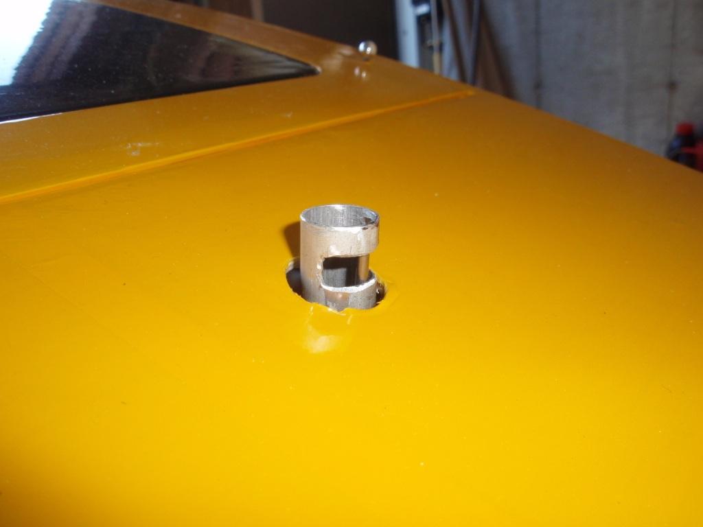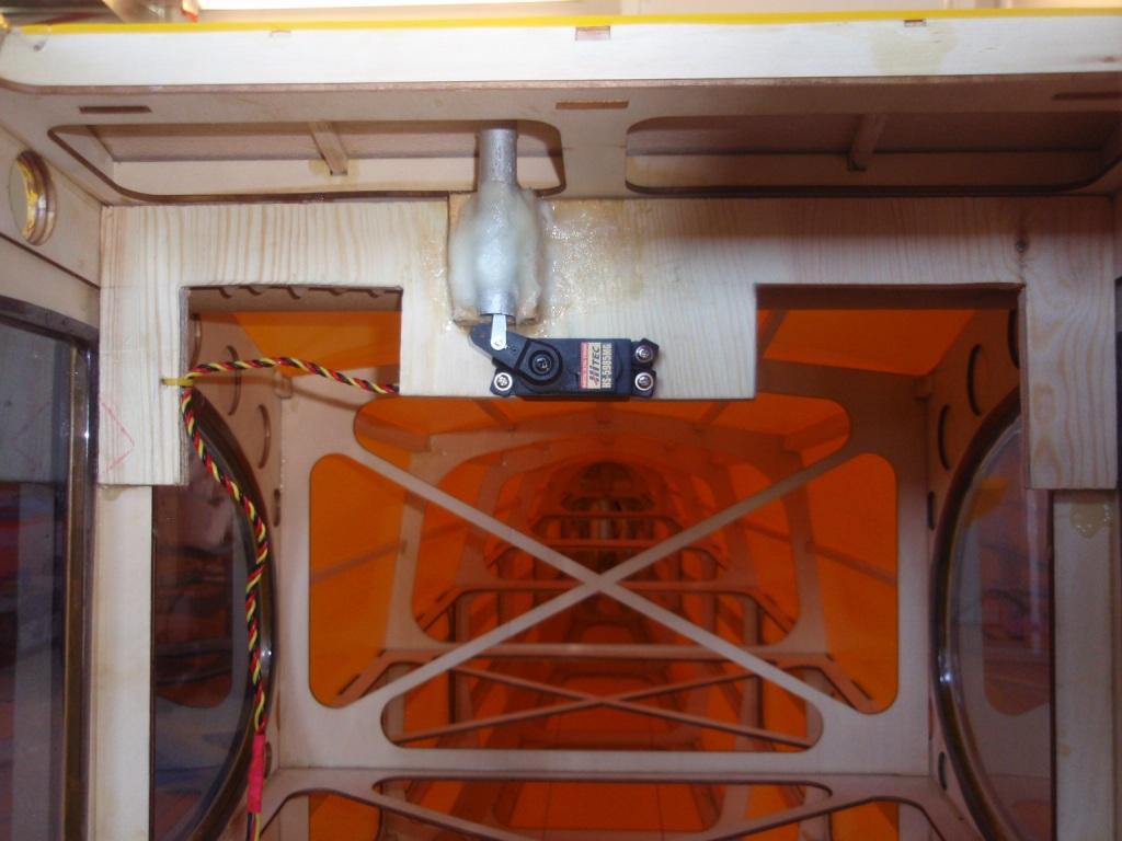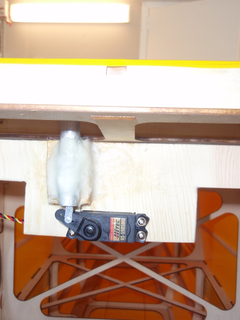 Selpekobling; laget et halvt spant tilpasset spantet like foran TE på vingen. Til dette spantet glasset jeg et aluminiums rør med en åpning i, en servo ble skrudd fast, og denne servoen driver en pianotråd forbi åpningen i aluminiums røret.