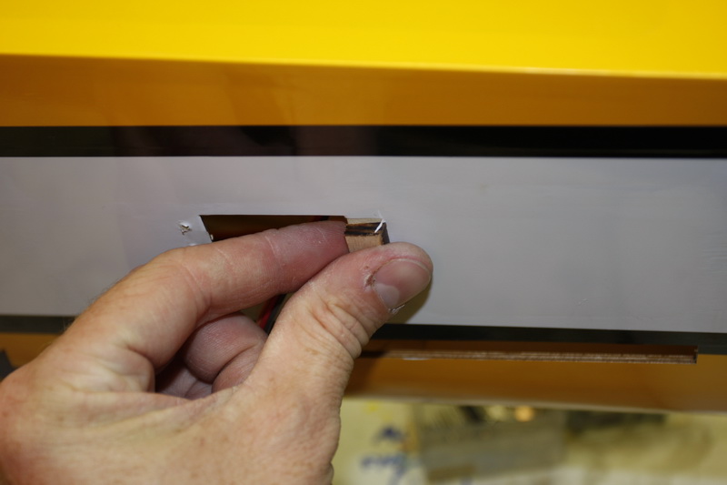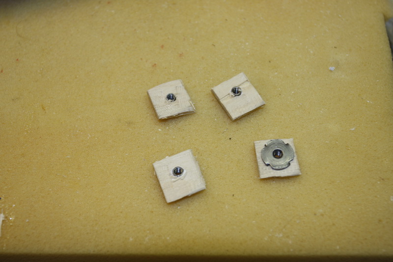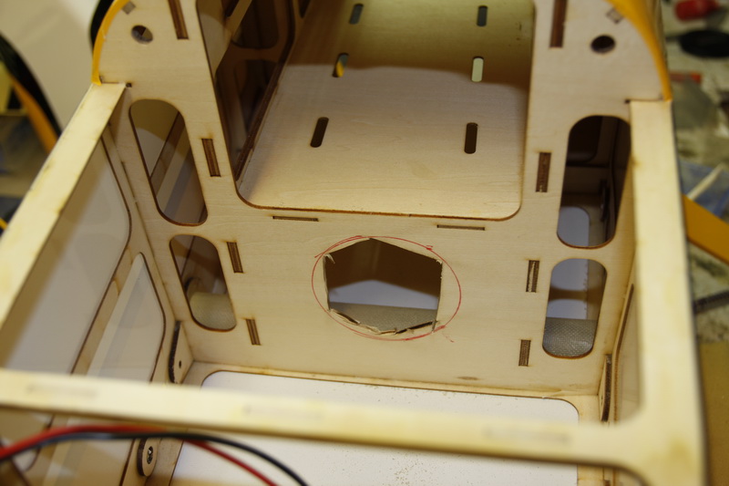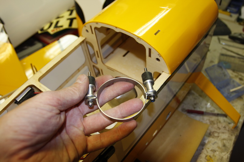 Feste av cowling skal gjøres med 3 mm treskruer i tynn balsa/plywood. Av erfaring vet jeg at dette ikke kommer itl å holde på en bensinmodell. Derfor limte jeg inn islagsmutterei små plywoodstykker og boret opp cowling og fly når den var i riktig posisjon. Fylte islagsmutterne med fett og limte de på plass inne i kroppen. Satt på en tykk skive utenpå og skrudde skikkelig til slik at de tørker når de er skrudd hardt mot ramma. I tillegg har jeg bestilt gummiskiver som fungerer ypperlig til å dempe ytterlige.