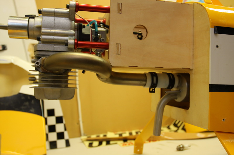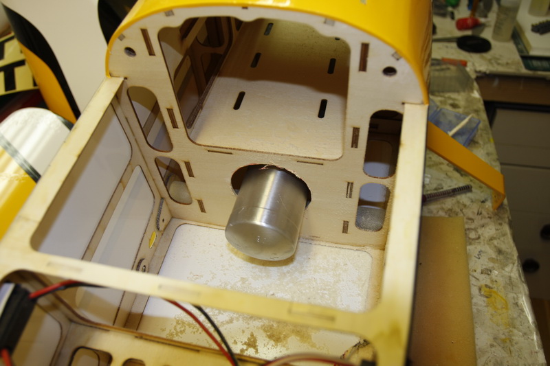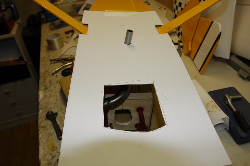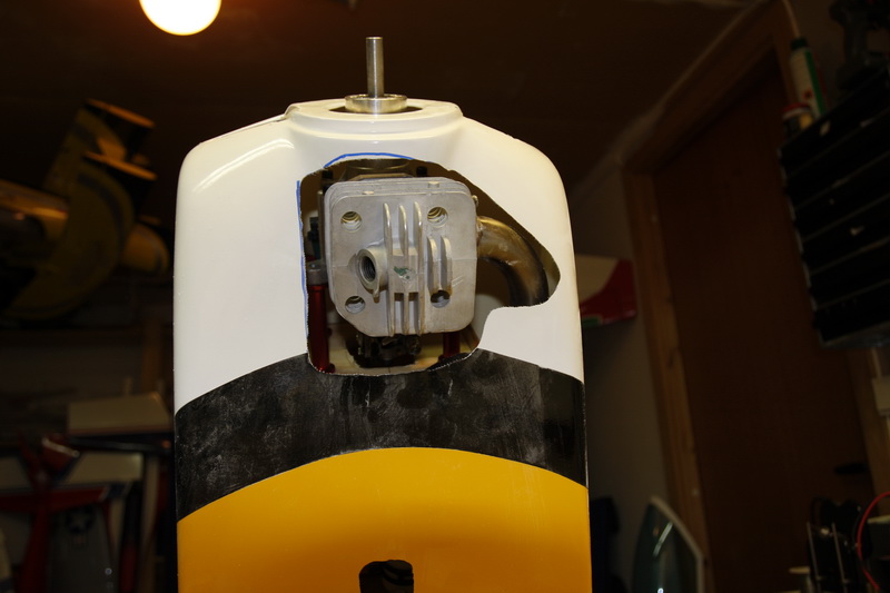 Som vanlig er det litt knot med å tilpasse en cowling. Som oftest går jeg på en smell og skal alltid ha så små gliper som mulig rundt alt og det hele ender emd at noe vibrerer borti og gir resonans og ødelagt galssfiber. Lagde nå en pappmal jeg klistret på bugen og tegnet av rundt potte, topp etc. Deretter er det bare å skru av motoren og tre på cowlingen til riktig avstand fra firewall til front av cowling og tegne der jeg lagde hull i malen. Litt av og på med småtilpasninger men det hele så greit ut til slutt.