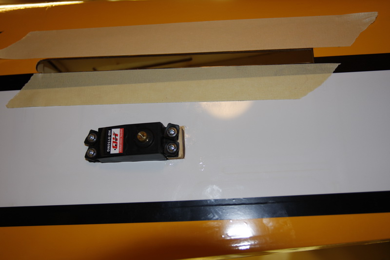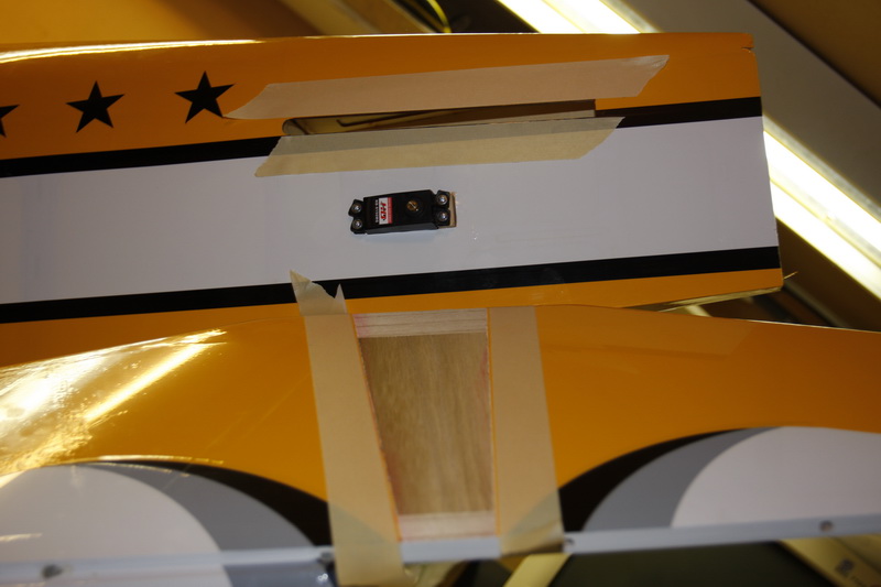Satt inn høyderorsservoene som har lik plassering på hver sin side bak og fant ut ad de var for dype med 3-4 mm totalt. Kuttet bort litt film i bakkant av servoen og lagde 2 utforinger for å slippe unna problemet. Litt epoxy og tørke godt så var de på plass. Servohornene er like som på resten og er nå kulemontert på begge sider.