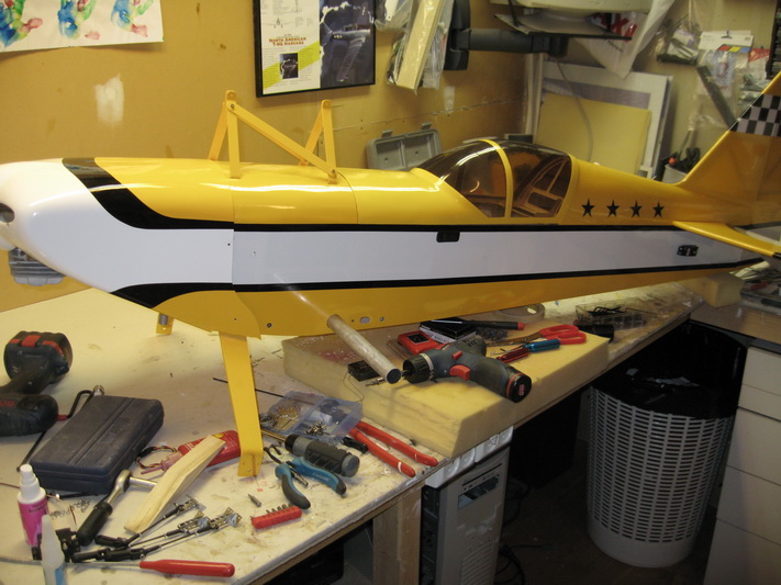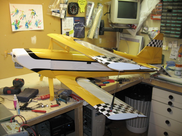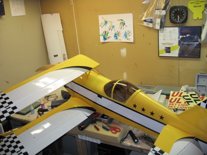 Nå hjelper det seg, fester til øvre vinge er på plass, staben er ferdig. Mangler montering av kåper og hjul samt halehjul. Deretter er det utveiing for å sjekke hvor batterier etc skal plasseres. Pakke ligger på posten med killswitch og diverse småtjafs.