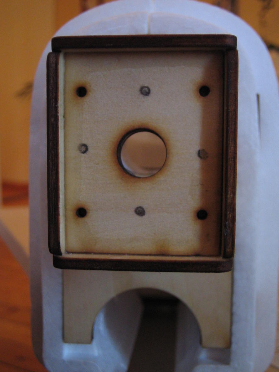 Brukte en skarp cutter og fjernet ca 2 mm rundt hele brønnen. Deretter fant jeg fren to trelister på ca 10x40 mm med 3mm tykkelse som skulle bli selve skru festet til understellet. Selve anlegget finskar jeg med cutter og pusset så med grovt sandpapir for best feste før jeg limte de inn med epoxy. Understellet ble satt på plass etter tørking og forboret med 1,5mm bor før jeg skrudde de på plass.