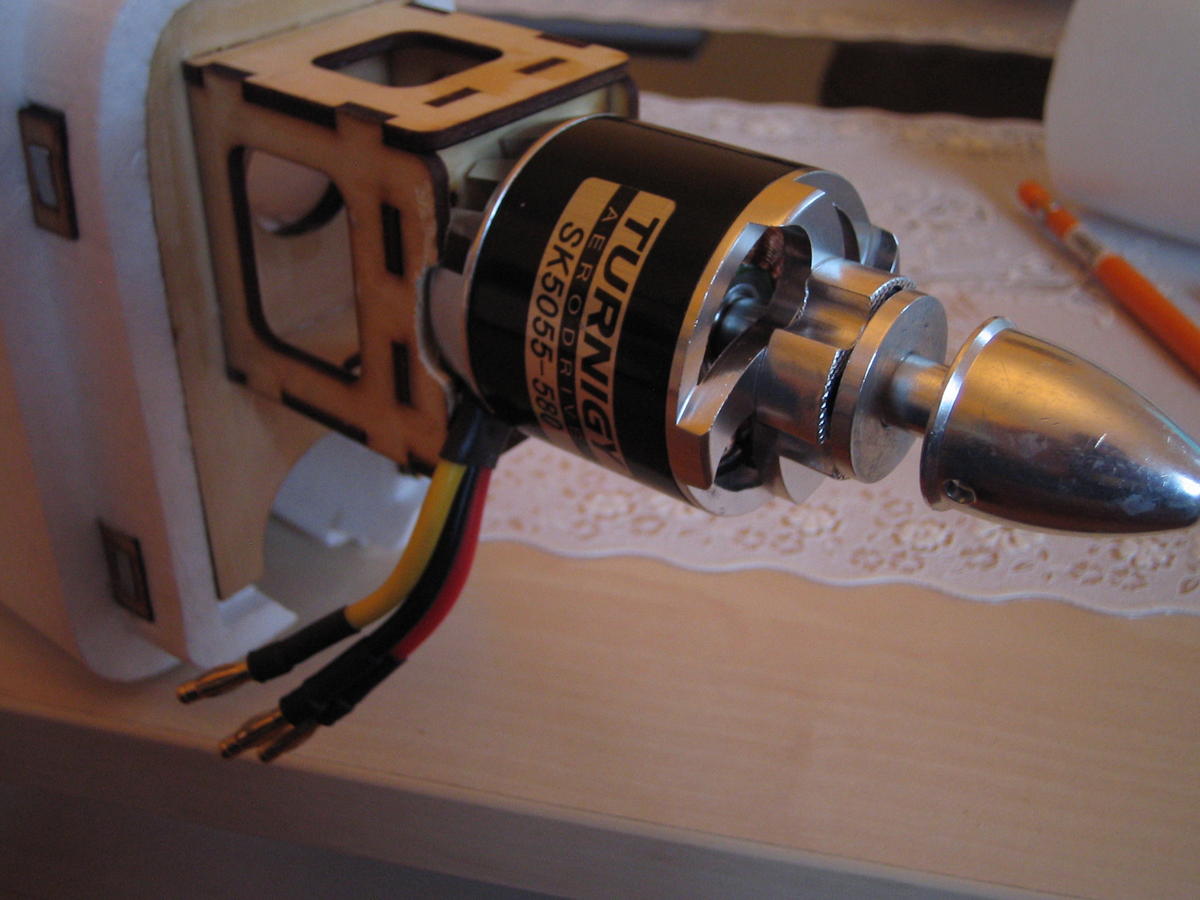 Ellers kan jeg nevne at jeg skal bruke denne Turnigy SK 35-42 1250 kv motoren, målte den til 570 watt med 11x8,5 APC prop og 3S og håper det blir nok. Motoren passer iallefall P E R F E K T, ingen tilpassing nødvendig og propelladapteret går akkurat klar av cowlingen.
