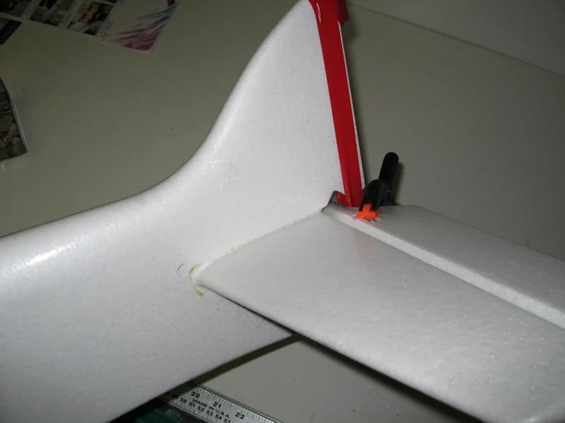 Deretter påførte jeg lim på staben og presset den på plass i ferdig slisset spor i kroppen. Den så rett og bra ut med øyemål. Limte så i samme slengen inn sideroret med pinnehengslene i finnen.