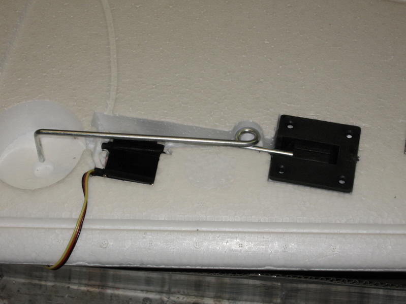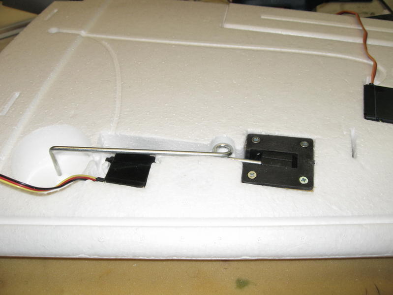 Servoen prøvetilpasses og jeg lager samtidig en justerbar link på ca 40 mm for å felle ut og inn understellet. Radioen settes opp slik at jeg bruker bryter og slaver en kanal til å gjøre jobben da det blir en servo i hver ving. Utslagene settes sånn omtrentlig og finjusterer etter hvert. Bedre her med for lite utslag enn for mye slik at man ikke stripper servodrevene.