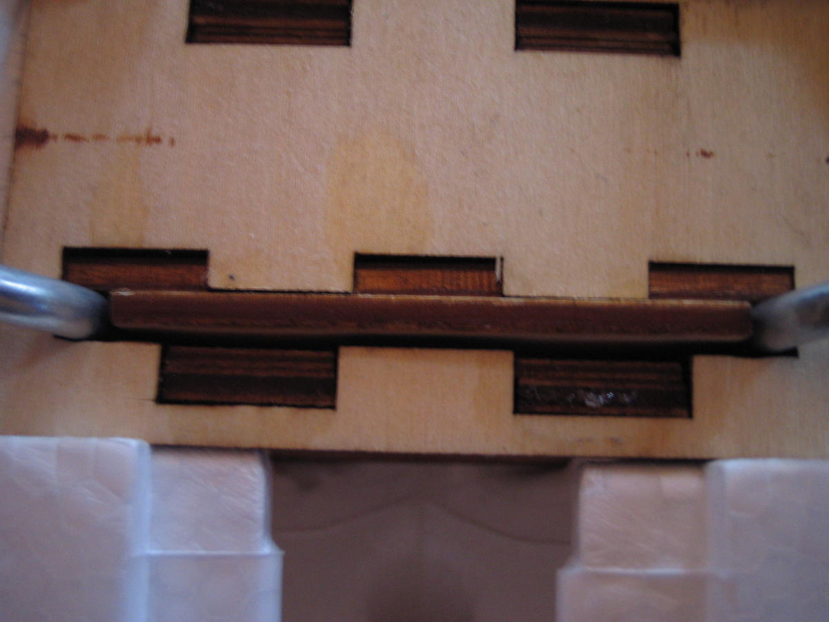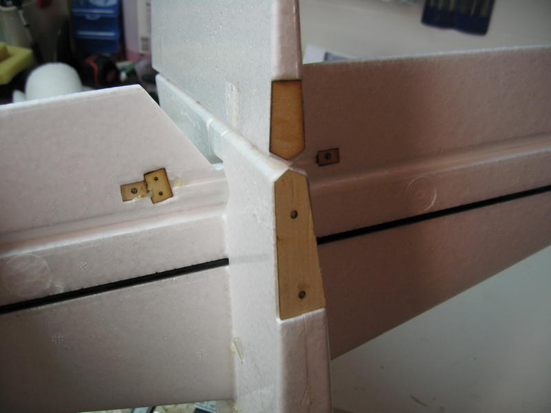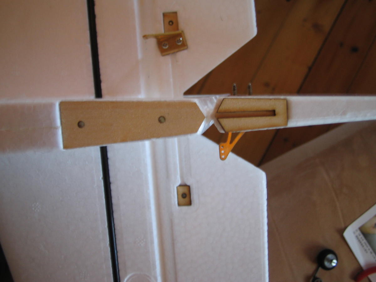 På min modell fulgte det ikke med låsebiter for å holde vingene på plass. Vingene trykket jeg på plass inn i kroppen og mine var veldig trange, men med litt lirking slapp jeg å pusse. Fant noen 3 mm plywoodbiter på ca 2x8 cm som jeg trykket ned i slottene midt inne i kroppen. Det er mer enn nok til å holde vingene på plass.