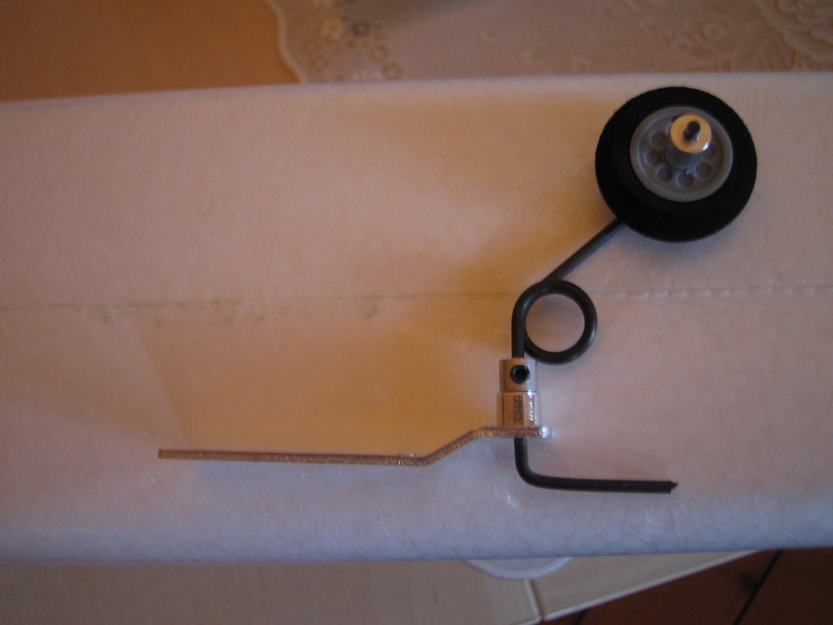 Trebitene til halehjulet ble limt fast pluss at jeg bøyde og kuttet til nesehjulet. Jeg kuttet noen millimeter for mye, men tror det skal gå bra. Det jeg derimot glemte var å lage ett lite spor i den underste plata på sideroret. "pianotråden" er tykkere enn den finerbiten med spor slik at den øverste biten ikke sitter plant. Jeg filte litt på topploket, men burde også ha filt litt på den nederste.