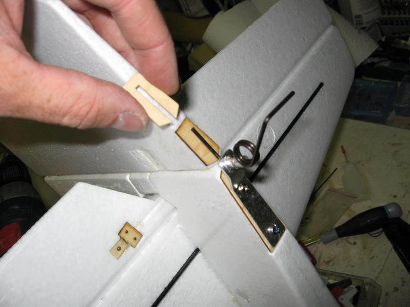 Etter at stab var tørket ferdig gjorte jeg klart halehjulsbraketten. Limte på plass plywood på undersiden av kropp og sideror. Deretter skal braketten skrus opp i kroppen gjennom plywoodplaten. Pianotråden bøyes til i nitti grader slik at den stryker oppunder siderorsplaten som er limt inn. Klipp den av med kraftig avbiter og lim på plass de to plywoodplatene som vist på bildene under.