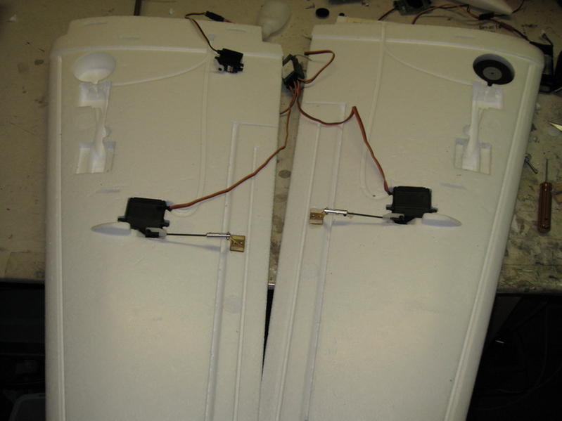 Vingene med opptrekkbart var klart og jeg satte inn balanserorsservoene, justerte subtrim og skrudde fast linkene. Servoene limer jeg med litt kontaktlim langs siden. Da sitter de mer enn godt nok. Brukte Loctite på alle settskruene som holder pianotråden i linkene. Dessuten må selve rorhornene bores opp til 2 mm for å passe de medfølgende skruene.