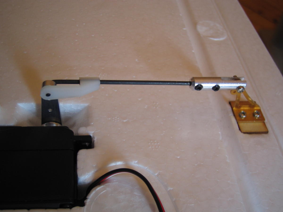 Tredde så pianotråden i hylsa og så at jeg måtte kutte av litt av hylsa på servo-siden for å få nok vandring på armen. Satte servoarmene på plass og sentrerte disse siden pianotråden må kuttes på andre siden. Satte så på link.