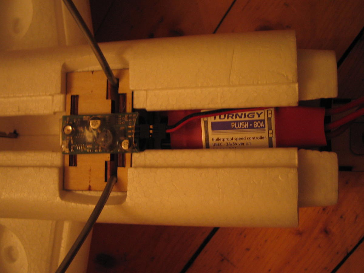 ESC la jeg som affa i det ledige rommet bak motoren. Utvidet det ene hullet som går inn i kroppen slik at jeg fikk dyttet signalkabel og deans kontakt igjennom. Mottageren plasserer jeg nærme de bakre servoene slik at jeg slipper kabelforlenger på disse.