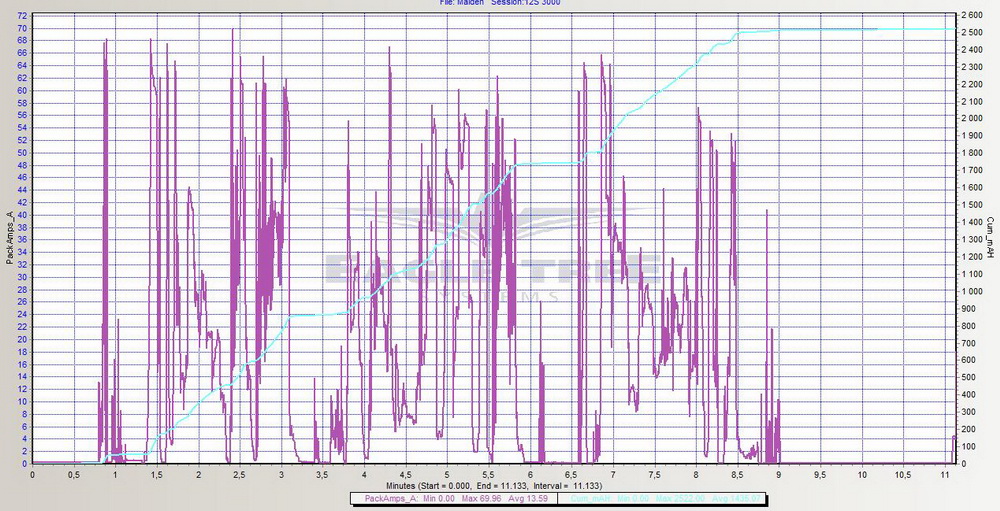 Ellers ligger det ved eagletree logger utskrifter på både 10S og 12S. Maksimalt strømtrekk er på henholdsvis 64 og 70A, noe jeg regner som meget bra i forhold til den kraften jeg har i modellen.