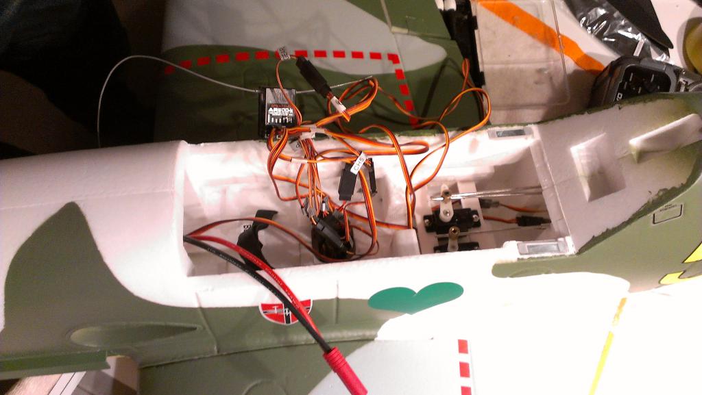 Husk å få alle servoledningene opp på oversiden av vingen. Det følger med skjøtekabler og ykabler som du nå gjør lurt i å koble opp riktig før du fester vingen til kroppen.