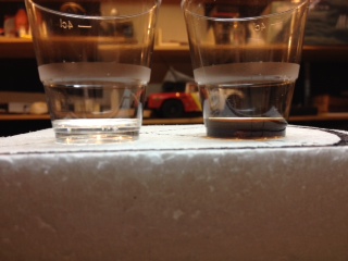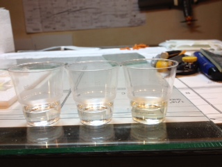 Biltema lamineringsepoxy skal blandes 2 til 1. Da blir det tre drammeglass, og blandingen tømmes og røres innom alle glassene før den ender opp i et glass til slutt.
