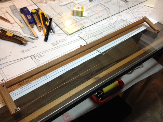 Har fundert en del på om jeg skal forsøke å trekke depron over spanter for å lage en kjerne til vingene. Det er jo ikke helt sunt med å skjære isopor med varm tråd. Men så fant jeg en sånn fin eikelist på Biltema når jeg var innom for å kjøpe flere drammeglass, så jeg skrudde likegodt sammen denne rammen for varmetråd på et øyeblikk så får vi se hva det blir til...
