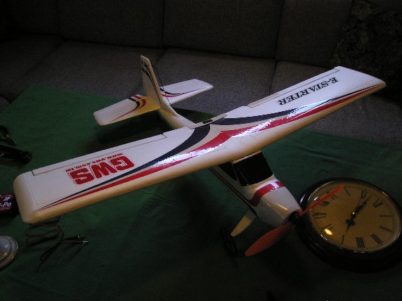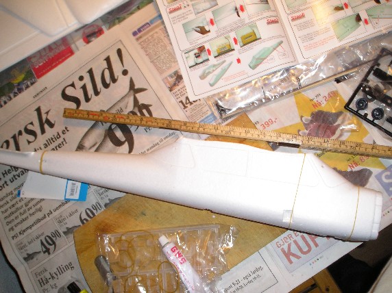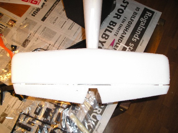 Leksene ble gjort uvanlig raskt og så var det ned i kjelleren. Bruksanvisningen var enkel og jeg gjorde som det sto. Etter hvert var de to halvdelene av kroppen limt sammen og alt uten problem så langt. Jeg merket at slangen som skulle gå fra servoene til halerorene var litt for kort i fohold til hva som stod i manualen, så det så vidt jeg fikk stukket den langt nok ut. Vingene ble påbegynt og her stod det feil i manualen. Det stod at jeg skulle lime en plastdel på forsiden av vingen, den skulle egentlig være bak. Dessuten skulle det først være en annen del på før den delen, og dette var ikke nevnt i det hele tatt. Jeg måtte tenke meg til det selv ved å se på bildet på boksen. Jeg merket også at flyet hadde litt simple løsninger. Hengslene mellom alle ror var kun av papir, noe som gjorde det litt vanskelig å dytte inn uten å bøye det. (Se bilder: E-starter for4, for6)