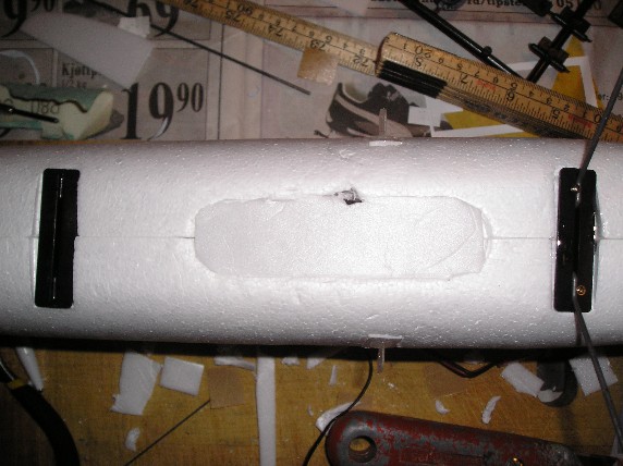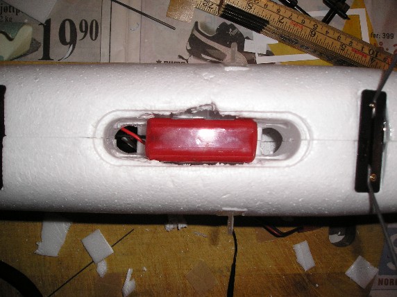 Den lille plastluken som fulgte med til å dekke for batteriåpningen var desverre litt for liten for mitt batteri og derfor droppet jeg den. Jeg lagde en egen, veldig enkel, vri: Et lite isoporstykke som jeg skjærte ut til å passe noenlunde. Brukte nåler til å få det til å sitte, skal bruke teip når jeg er ute å flyr. (Bilde: E-starter for10)