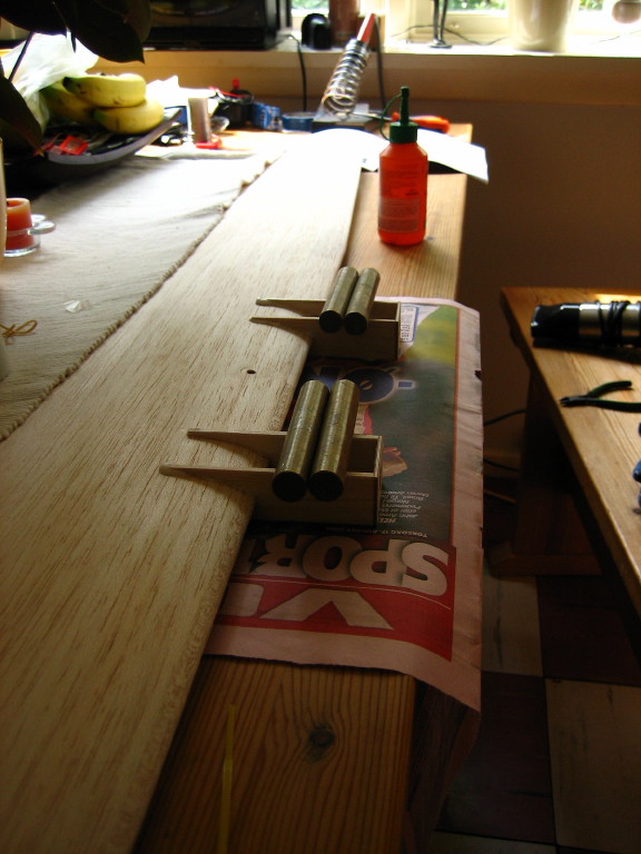 Har ikke bestemt meg for om jeg også skal lage funksjonelle vingestag, men mye taler for det også. Parasollmontasjen på det tynne glassfiberskroget blir nokså fleksibel, så jeg tror det vil være fordelaktig å stive det av.