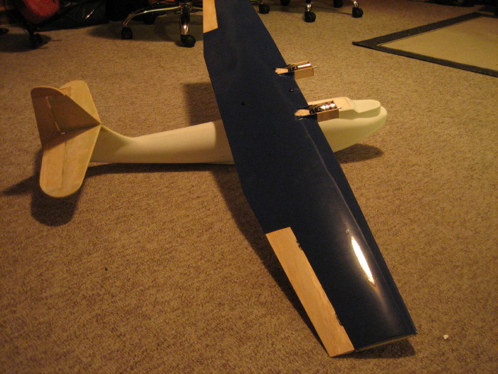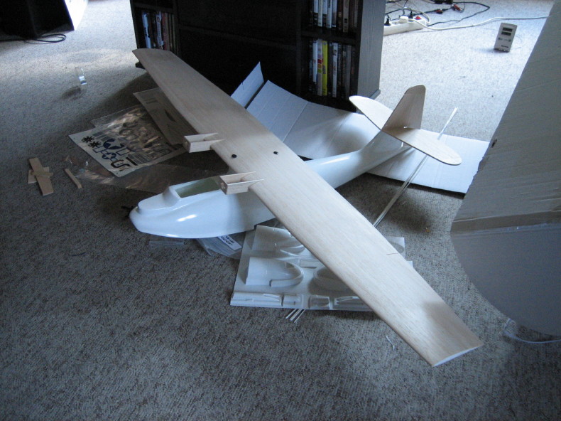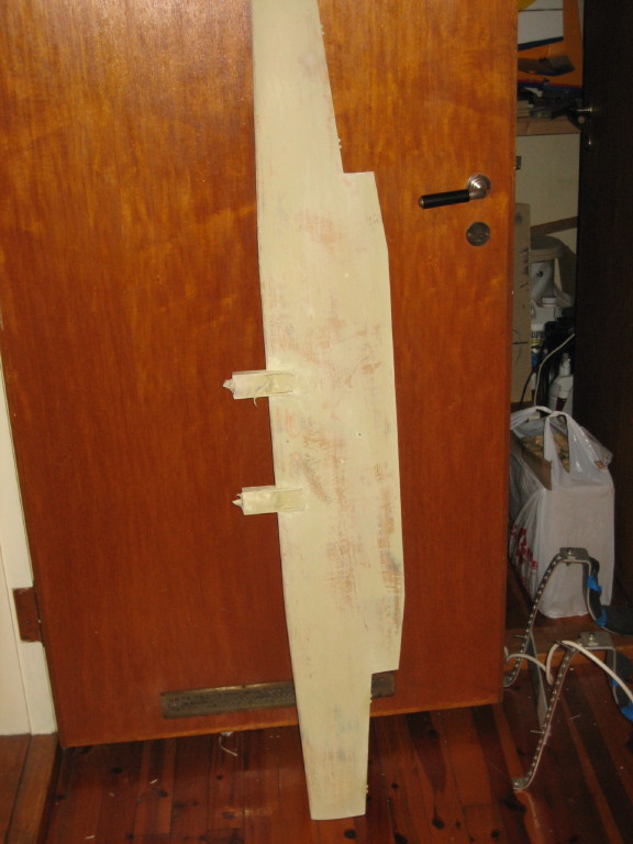 Jeg har valgt å glasse vinge og stab (all utvendig balsa). Dette blir sikker noe tyngre, men settet er i utgangspunktet veldig lett, så jeg håper på at det tåler den lille vektøkningen. Dessuten slipper jeg å tenke på å finne lakk som matcher trekk. Siste bilde er ferdig glasset vinge, grunnet og slipt og klar for lakkering. Jeg var litt ute av trening på glassing, så jeg greide å bomme kraftig på herdetid, noe som førte til en relativt tidkrevende slipejobb. Glassing av stabbe og ror gikk meget bedre