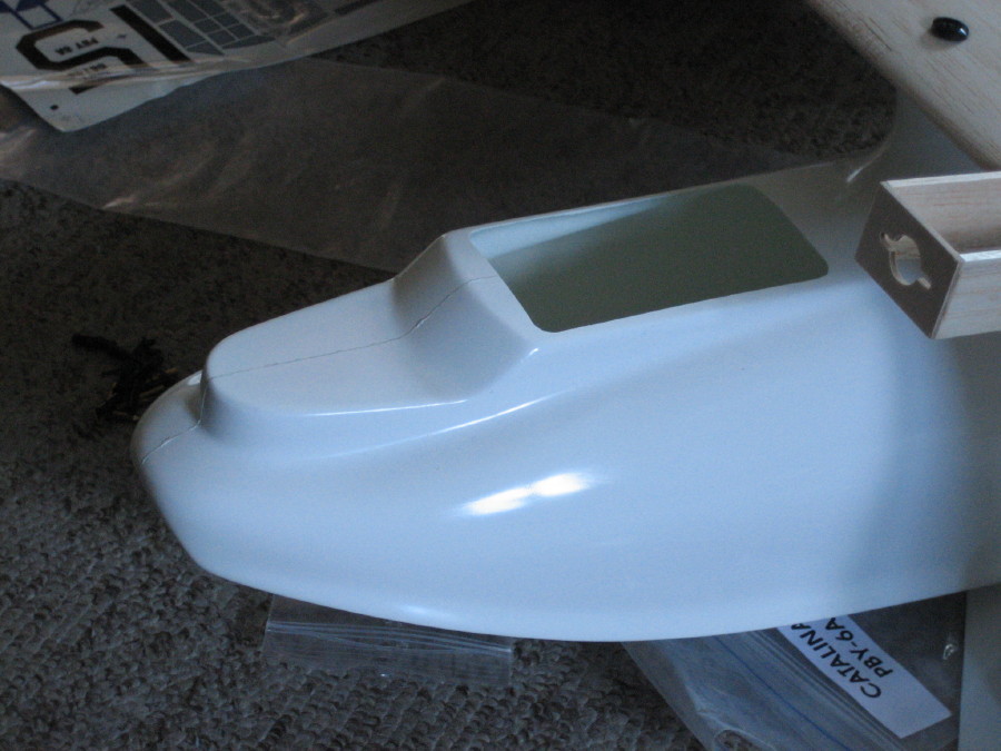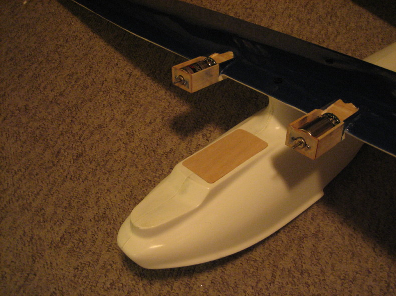 Den medfølgende batteriluken var en tynn ABS-plate som skulle ligge over hullet i nesa og tapes fast. Dette synes jeg var avsindig stygt og upraktisk, så jeg lagde heller en innfelt luke i balsa. Denne skal jeg også glasse og lakkere.