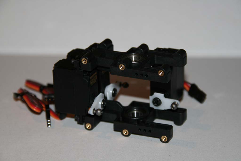 Det neste som skal gjøres, er å montere servoene i en egen ramme, som holder alle 3 servoer, samt de to øverste hovedlagrene. Den fungerer også som en forsterkning av ramma.