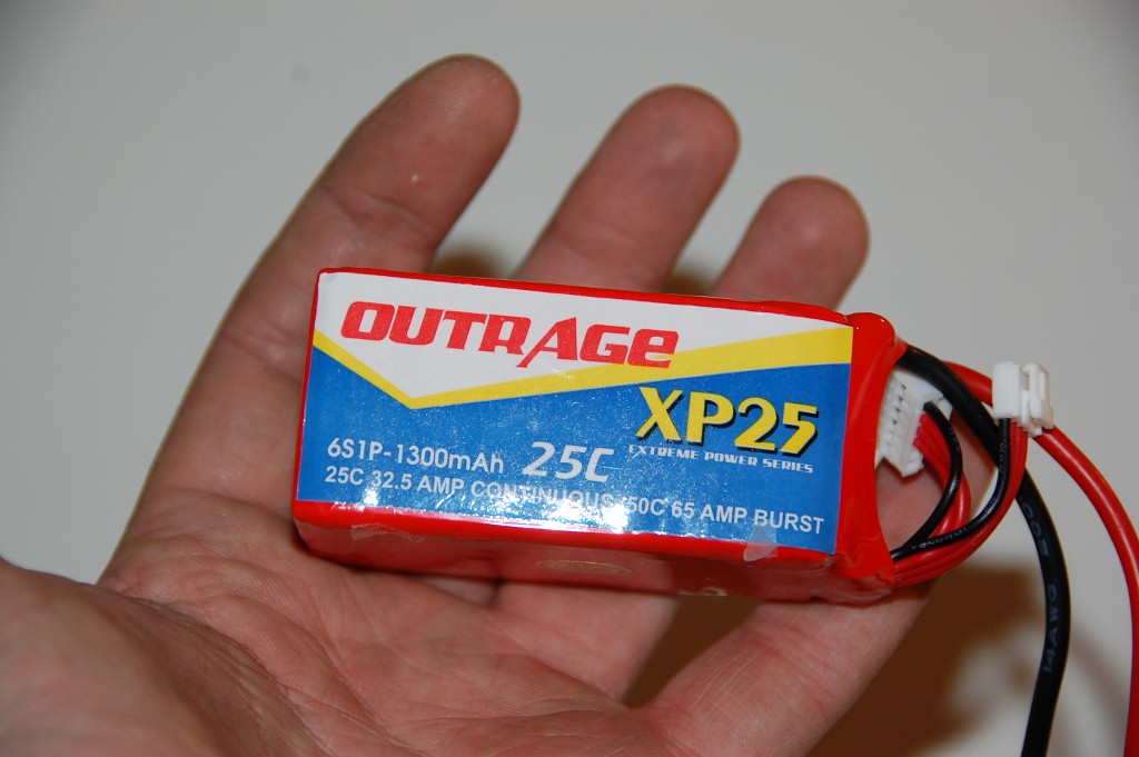 Batteriet blir fra outrage 6s 1300 mah, og det som gjør det så genialt er at man kan med en såpass høy spenning strekke flytiden ganske lenge utover det som er vanlig med et 3s oppsett. Man får et mye lavere ampere trekk på samme turtall med disse pakkene og derfor trenger man ikke så stor kapasitet.