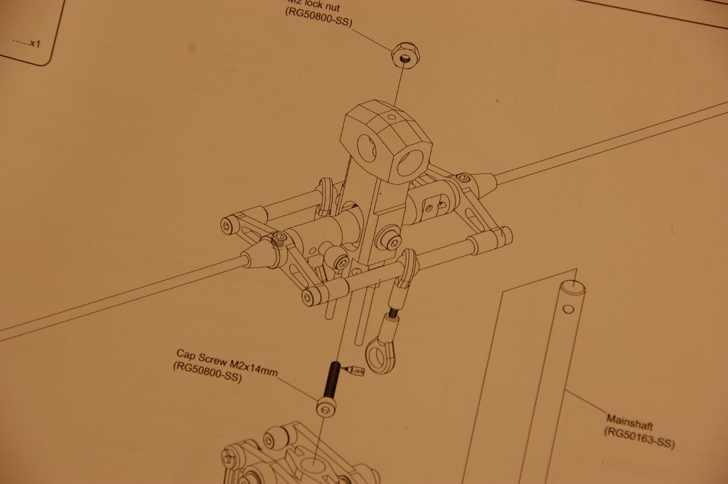 En foreløpig feil i manualen som jeg fant var at man vil man skal bruke locktite på skruen som holder hodet fast til hovedmasta, men det er ikke nødvendig da det sitter en låsemutter på denne skruen.