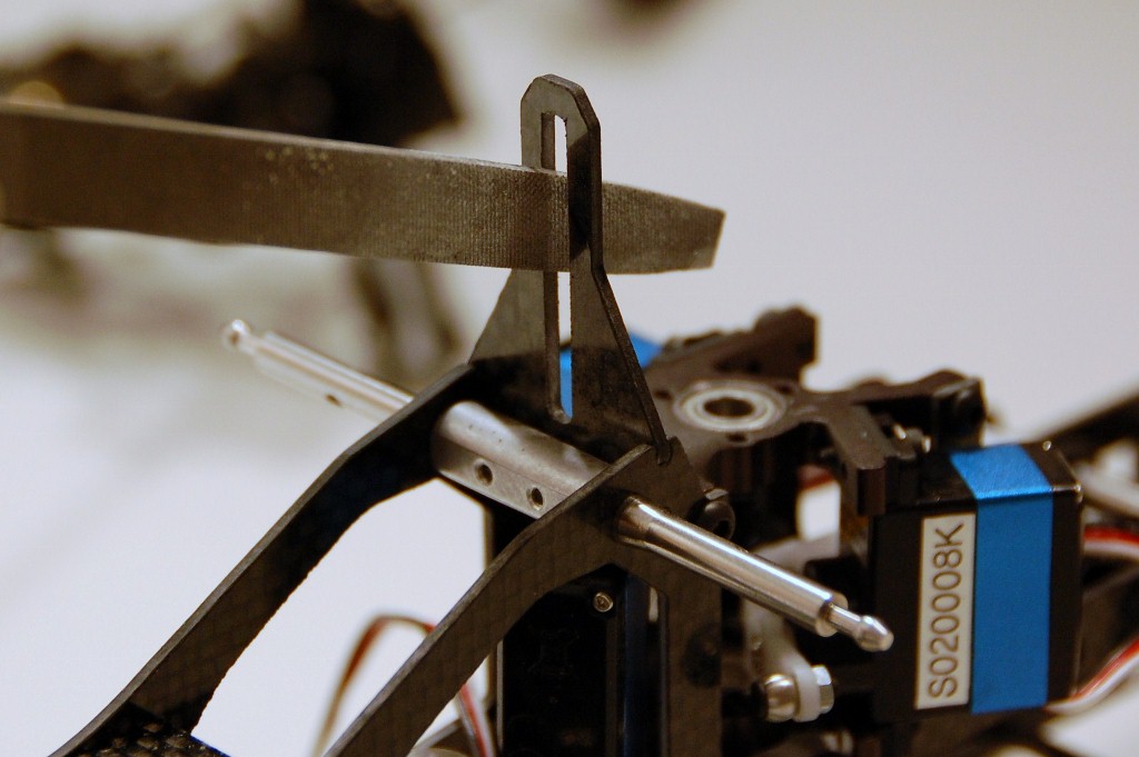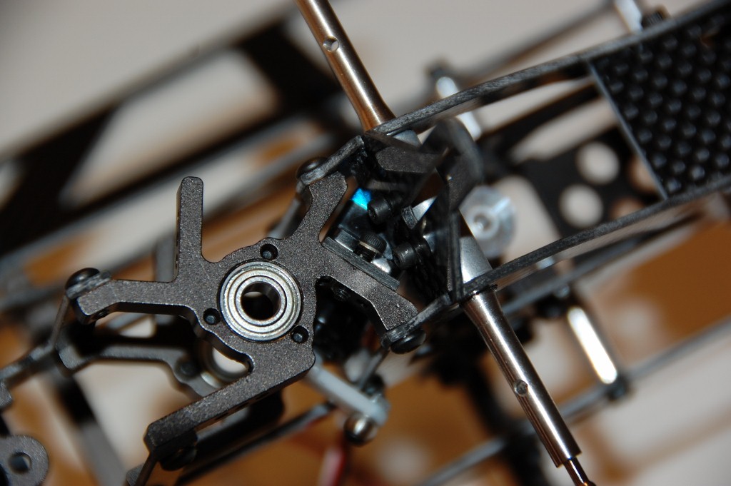Når jeg skulle montere canopyfestene fant jeg et par avik fra manualen. Som Mathias skriver i sitt review så har swashstopperen blitt oppgradert med en støtte i alu og denne er ikke vist i manualen.. En ting som denne oppgraderingen gjør er at det øvre servofestet på den ene servoen blir helt utilgjengelig uten å skru av hele swashstopperen med støtte.