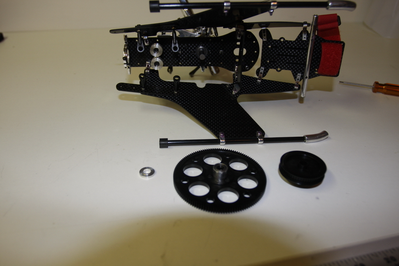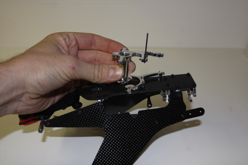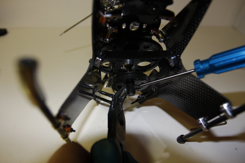 Jeg starter med å montere anti-rotasjonsbraketten, swash og ferdigbygd mast. Braketten settes på plass om skrus fast undenfra. Inn med swash og trer så masten ned gjennom kroppen med stopper på oversiden samt på med hoveddrev og gjennomgående skrue i bunn med silikonmutter.