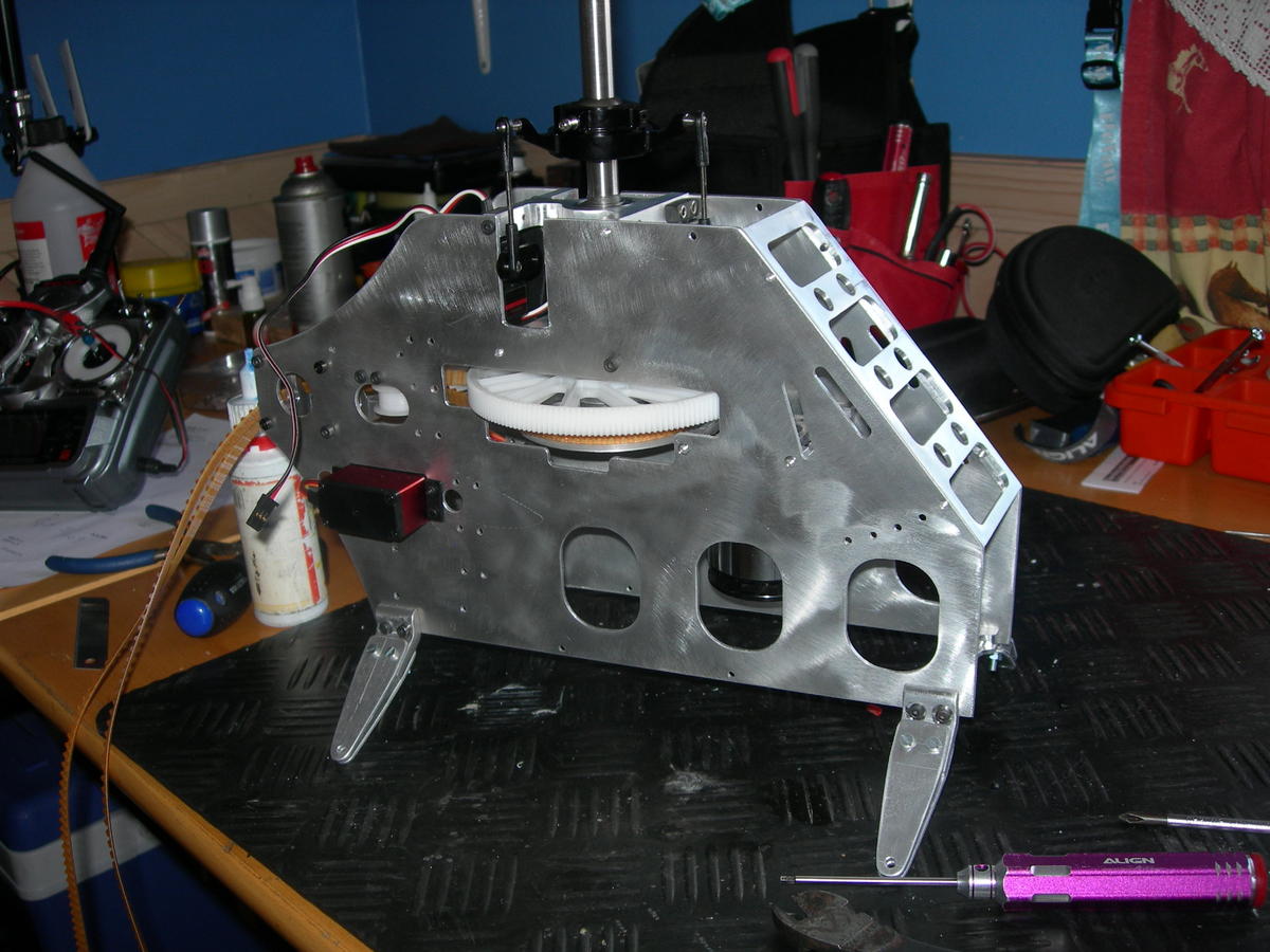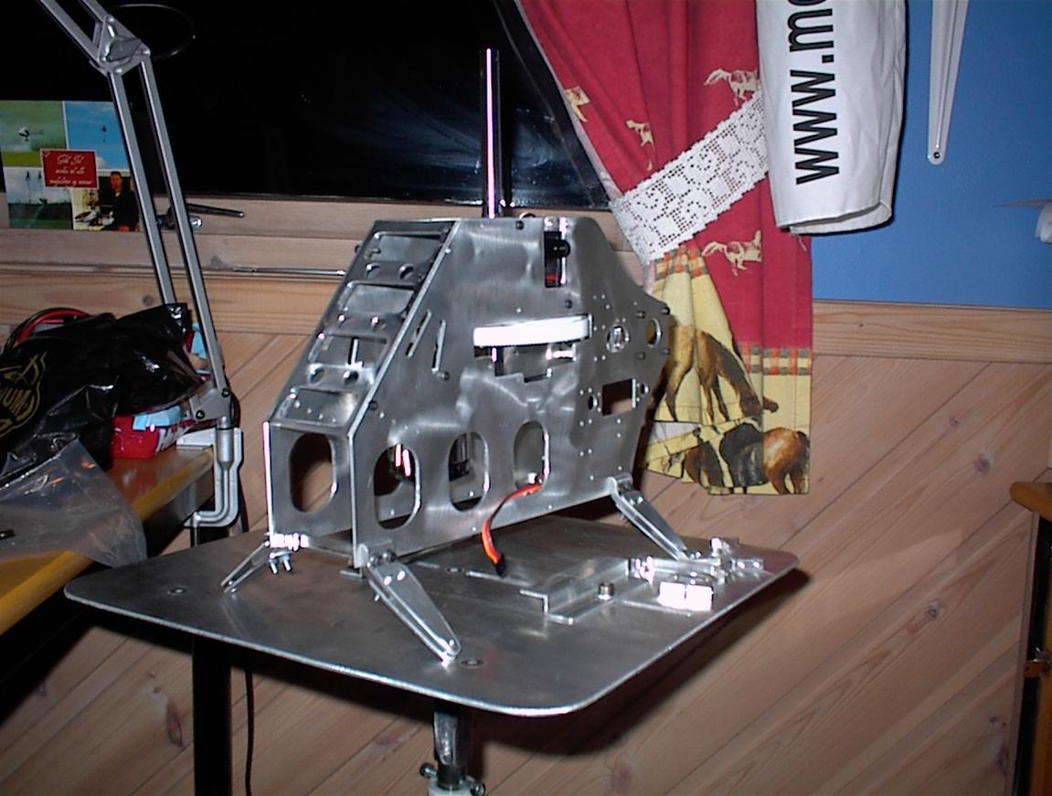 Sånn den står nå, med 4 servoer, mast, swash, komplett halekasse, reim, alt av drev, motor, skids, batteriplate, ja stort sett det som dere har sett blitt laget, veier den 1700gram.