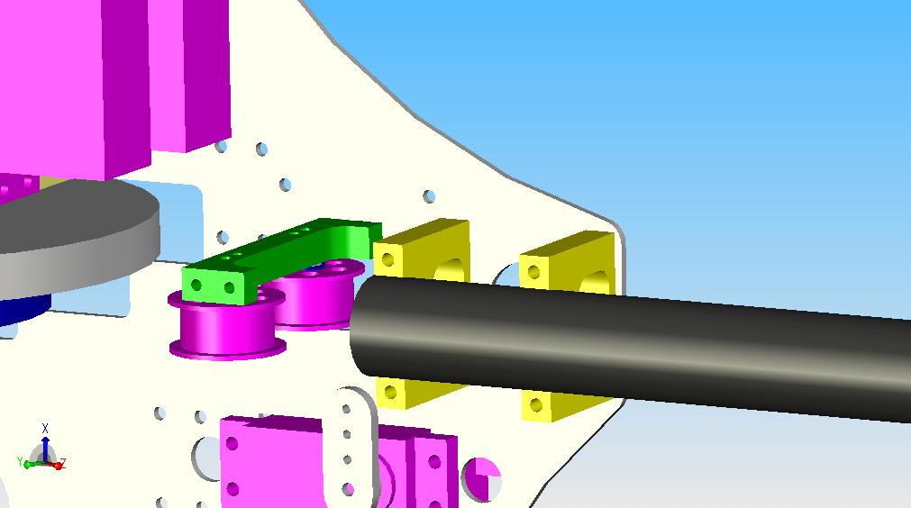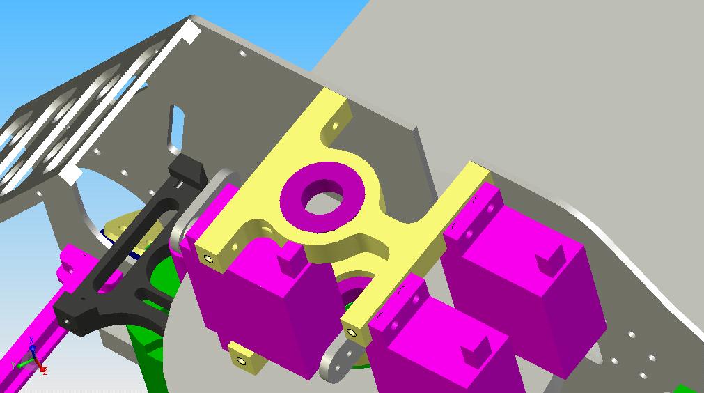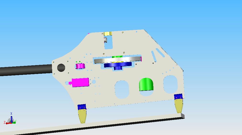 Tok frem Solidworks og satte igang og tegne, Staret med servo innfestingen i rammen, hadde en mening om åssen det skulle være, etter mange utkast fikk jeg et som jeg likte, etter dette kom enveis-lagerhub, motorplate, ramme, batteri innfesting, halebomfester, rammestivere, skidfester, skid.