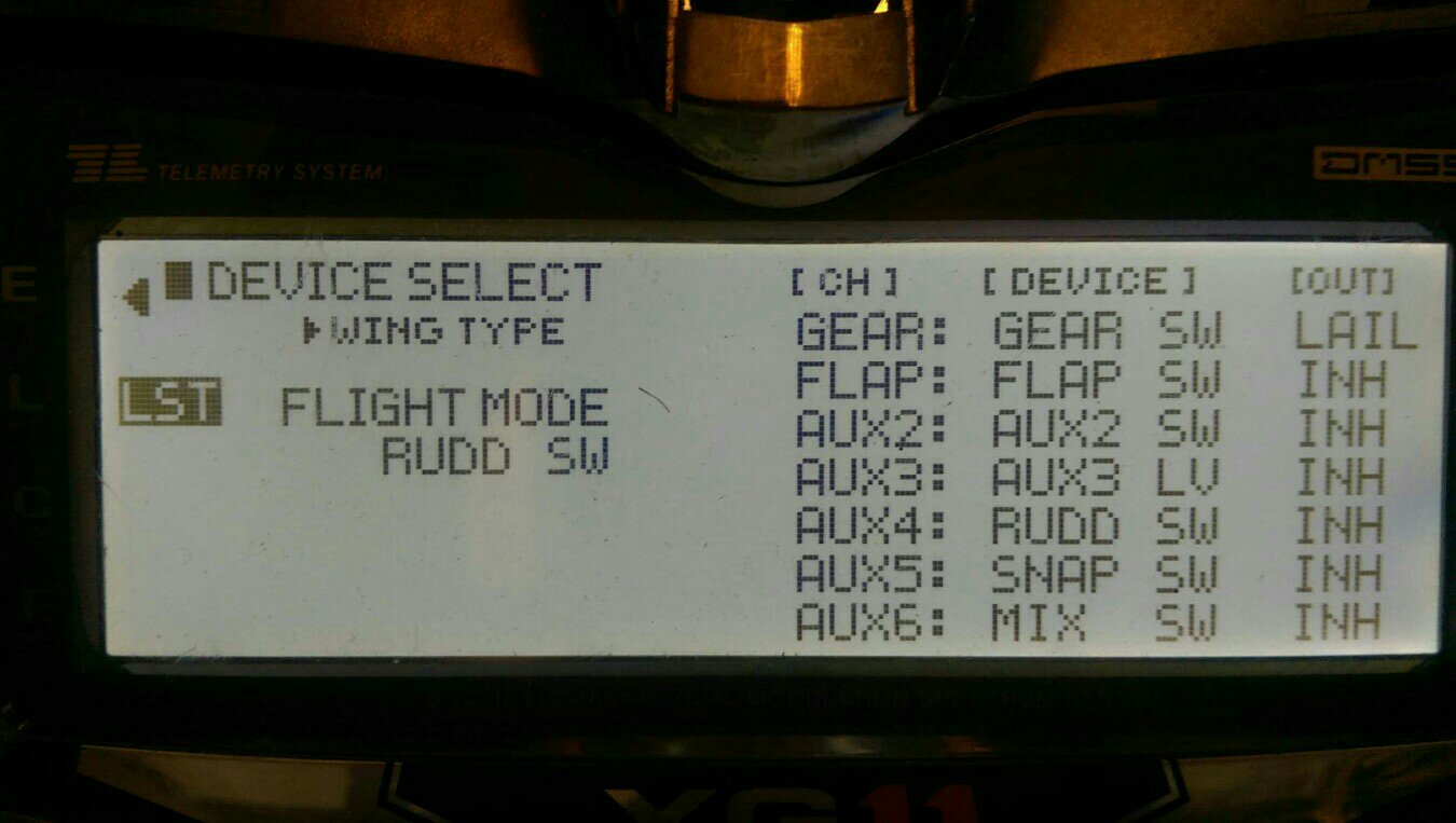 Programmeringen er jo forholdsvis enkel på denne modellen. Bruker JR XG 11 og der er det bare å velge ny modell, sette std vinge men velge riktig kanal under WING TYPE som kommer automatisk når du setter opp ny modell.