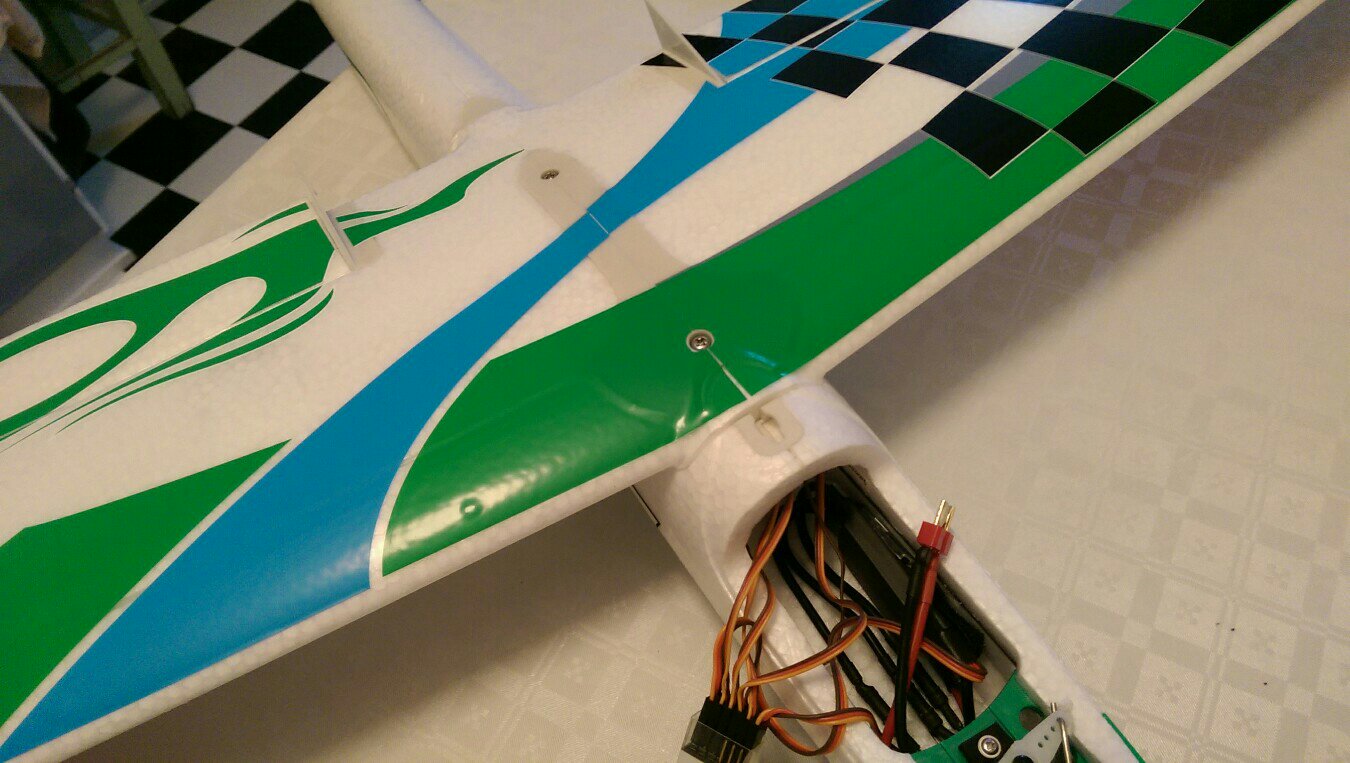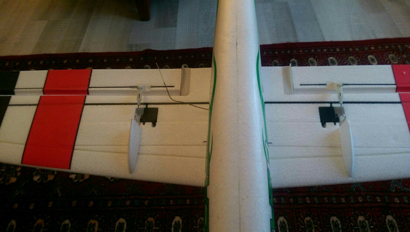Vingen har også ferdig montert servoer, bare å tre kablene ned i hullet og fremover. Det følger med Y-kabel men jeg hadde mottaker med nok kanaler og ville heller ha muligheten til å programmere feks differensial.