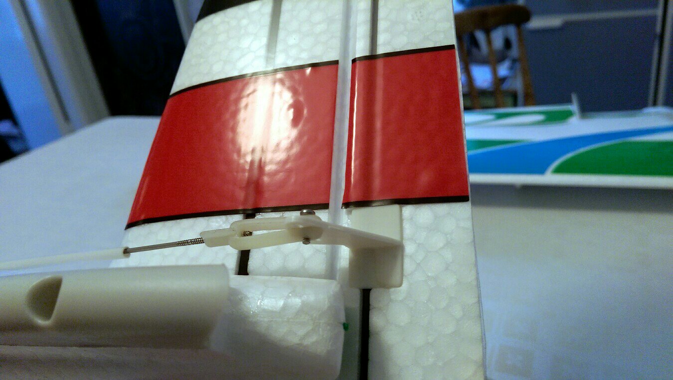 Linken er klar men må skru ut den lille skruen, sette linken over rorhornet og skru på plass igjen. Pass på at du skrur skruen godt inn i linken men ikke så hardt til at roret går tregt.