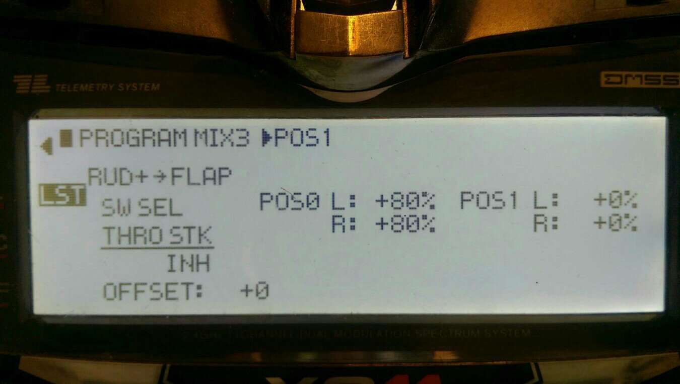 Da ser det slik ut. At det står RUD->FLAP betyr bare at det er FLAP kanalen (der jeg satt inn side thrust servoen) som skal slave etter sideror. Startet med 50% utslag men har økt det etterhvert.