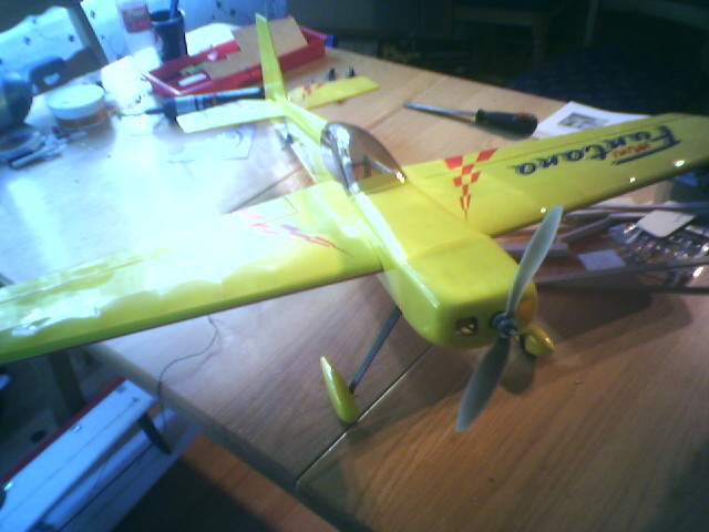 Dette er ganske så enkelt. Tre karbon røret inn i en av vingehalvdelene. Tre så dette røret inn i det bakre glassfiberrøret som går igjennom fly kroppen. Tre deretter på den andre vingehalvdelen. Bakerst på vingehalvdelene er det en liten tapp som skal inn i hvert sitt lille hull. Den ene vingehalvdelen min fluktet ikke helt i bakkant mot flykroppen så jeg tok en dråpe CA og limte de fast. Jeg kommer ikke til å verken demontere eller gå over til å bruke det fremre vingefestet med det samme uansett. Det var ikke så stort mellomromm at det ville hatt noen betydning, men av estetiske grunner valgte jeg nevnte løsning.