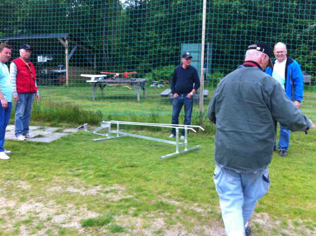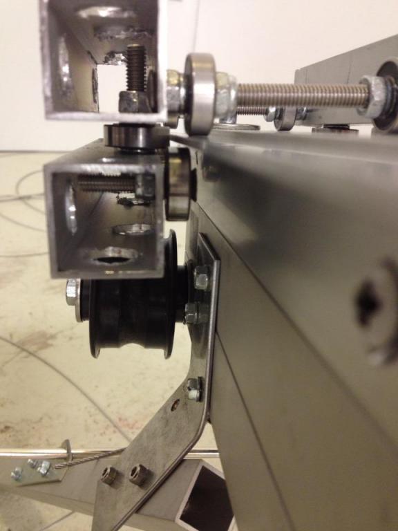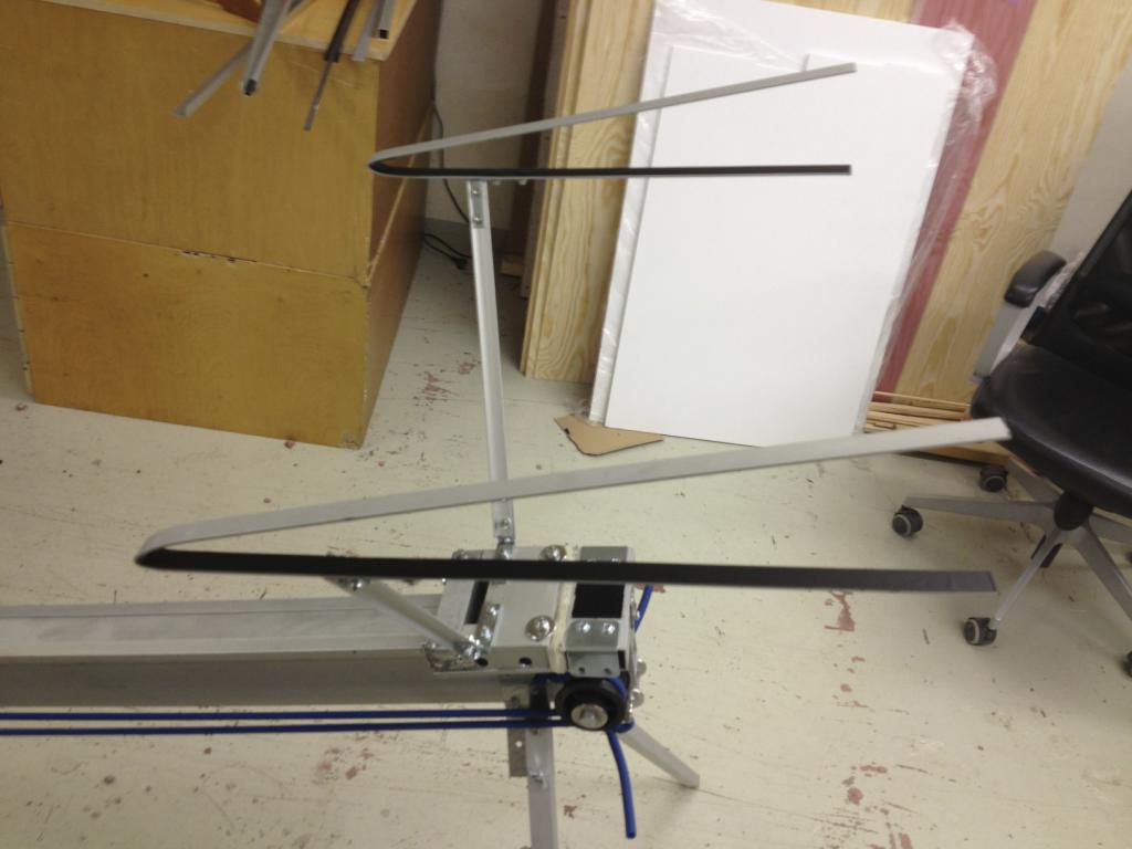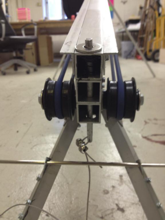 Her er noen flere iPhone-snapshots, kan ta noen med et skikkelig kamera senere. Slideren har fire kulelagre, og jeg har byttet ut den opprinnelige pedalen med en 10 meter stålwire slik at jeg kommer på komfortabel avstand til flyet og katapulten. I og med at jeg er "blind" med videobriller under takeoff er det ikke noe særlig å rote rundt med foten i nærheten av en karbonpropell (jeg kommer til å ha motoren i gang før og under takeoff).