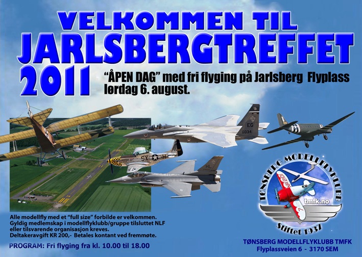 Vi ønsker velkommen til årets Jarlsbergtreff lørdag den 6. august. Det blir fri flyging for alle deltagere fra kl. 10 - 18 på våre 350 meter lange asfalt- og gresstriper. Treffet er åpent for alle typer fly med fullsize forbilde. Det er ingen konkurranser, men vi satser på godvær, mye flyging og hyggelig samvær. Vi har åpen kiosk, og det er anledning til enkel camping på plassen.