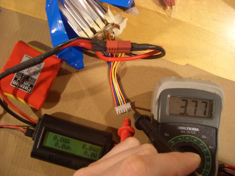 LiPo batteriet var dødt etterpå da jeg målte på Deans kontaktenmed multimeteret. Jeg målte cellene individuelt via balanseringskontakten og alle cellene viste nøyaktig 3,76 volt, bortsett fra celle 2 som viste ca 0 volt.