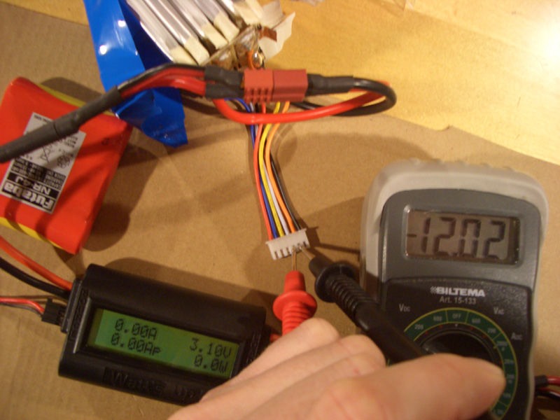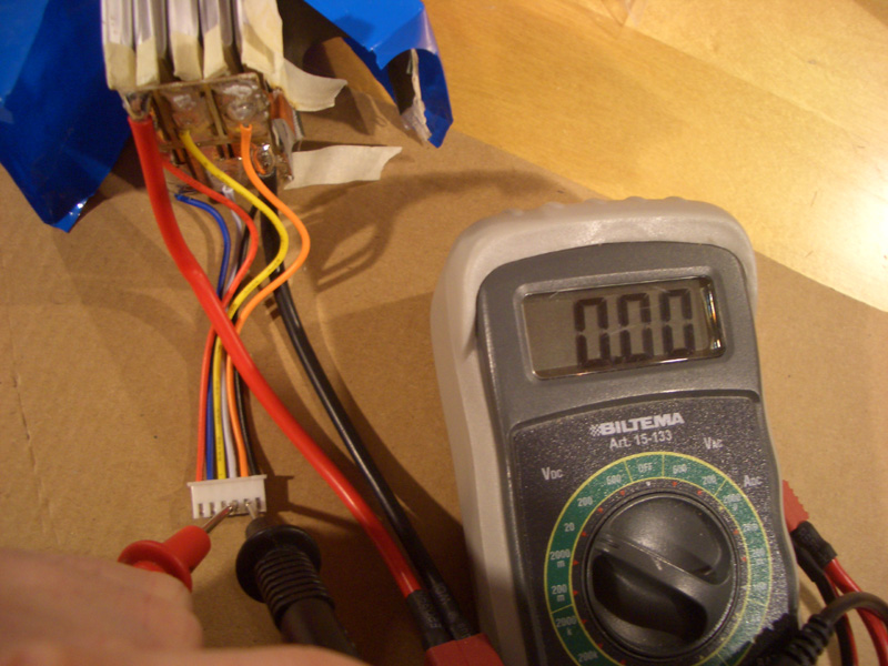 Bilde med 3,76 volt mellom pin 1 & 2 = alt i orden (alle celler er ok bortsett fra celle nr 2 med orange/hvit ledning til balanseringsplugg)