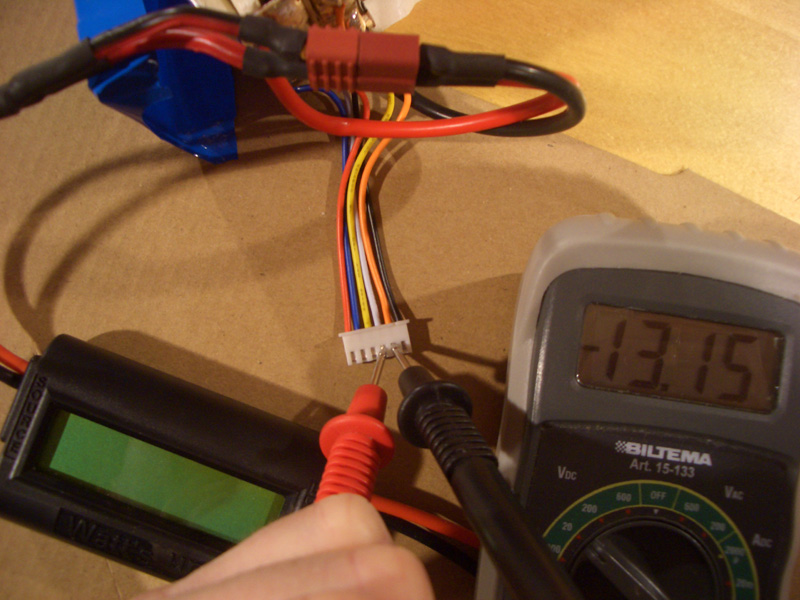 Måler du med minus målepinnen på voltmeteret på den sorte ledningen ut i fra balanserings pluggen og flytter pluss målepinnen fra voltmeteret utover vil du på første pinne måle spenningen over celle 1 (la oss si denne er 4.2V), flytter du pluss målepinnen et hakk videre vil du måle spenningen over celle 1 og 2, d.v.s. 4.2. + 4,2 = 8,4V, neste pinne vil være 4,2 + 4,2 + 4,2 = 12,6V,