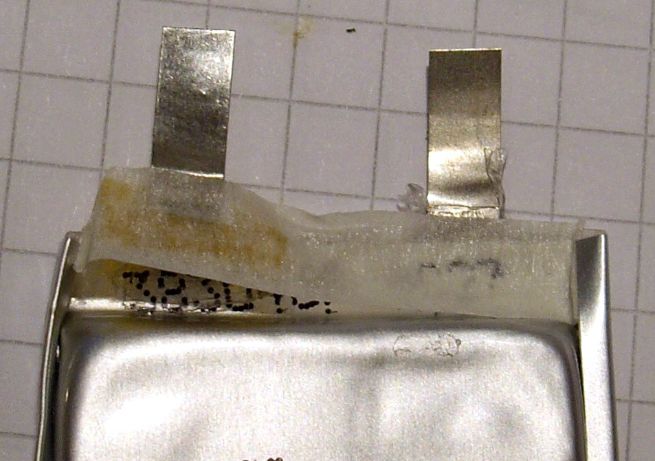 Hver av battericellene har to ledere (tynn flat fortinnet kobber folie - se bildet under) som kommer ut av aluminiums posen med elektrolytten. Det er disse "leppene" som går gjennom hullene og er loddet til monterings print plata (plata hvor alle ledningene sitter festet)