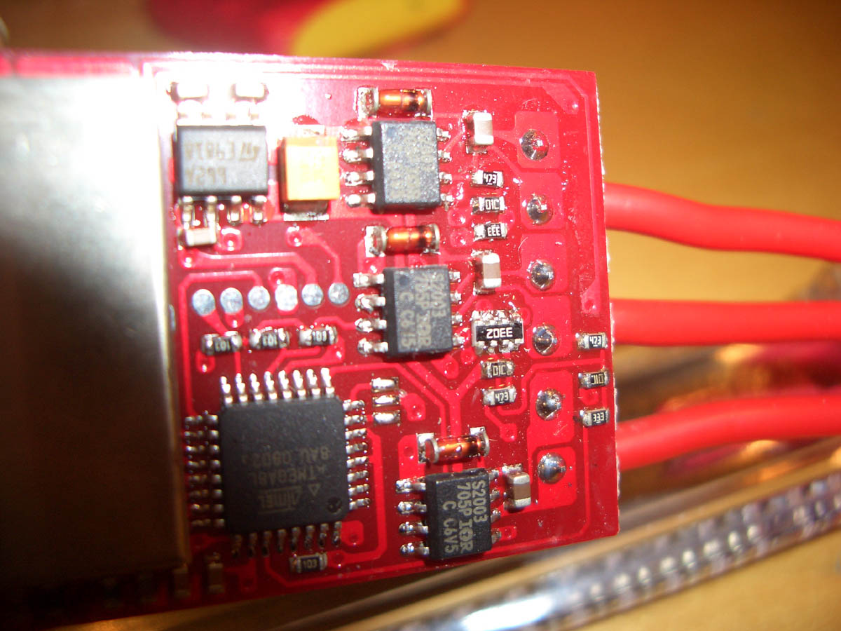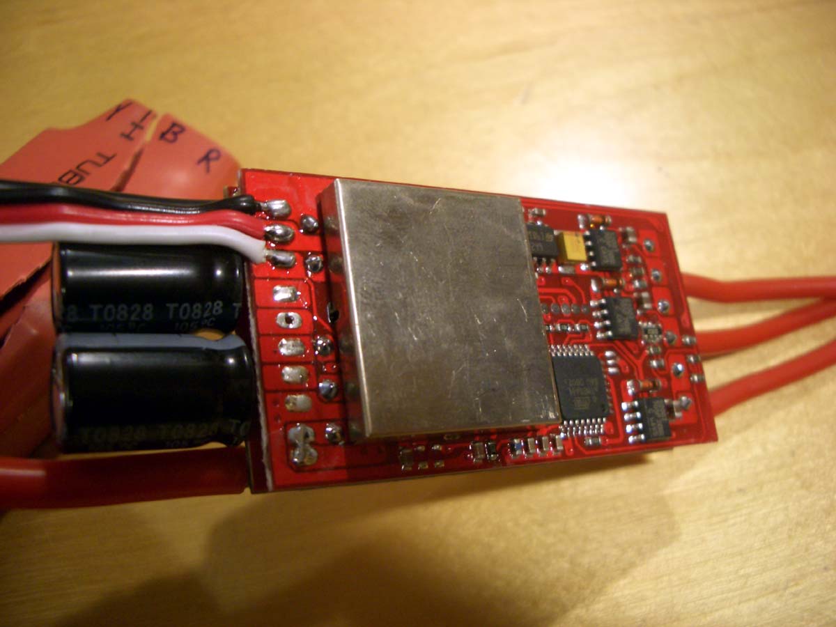 Et annet område som er interessant er 5V regulatoren til microcontrolleren (svart firkantet liten skøyer med en mengde små bein rundt) og den switch'a BEC delen - ligger under metall dekslet ikke langt unna der hvor ledningen går ut til servopluggen